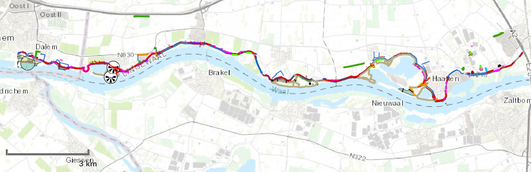 Vastgesteld kan worden dat de weg van de 'Gastvrije Waaldijk' voor een belangrijk deel over het dijklichaam komt te liggen. Er zijn bepaalde trajecten waarbij de 'Gastvrije Waaldijk' over bestaande wegen loopt en door bestaande kernen langs de Waal gaat. Het gaat hierbij bijvoorbeeld om Haaften en Herwijnen. Voor zover de 'Gastvrije Waaldijk' over het dijklichaam loopt is dit meegenomen in dit bestemmingsplan.